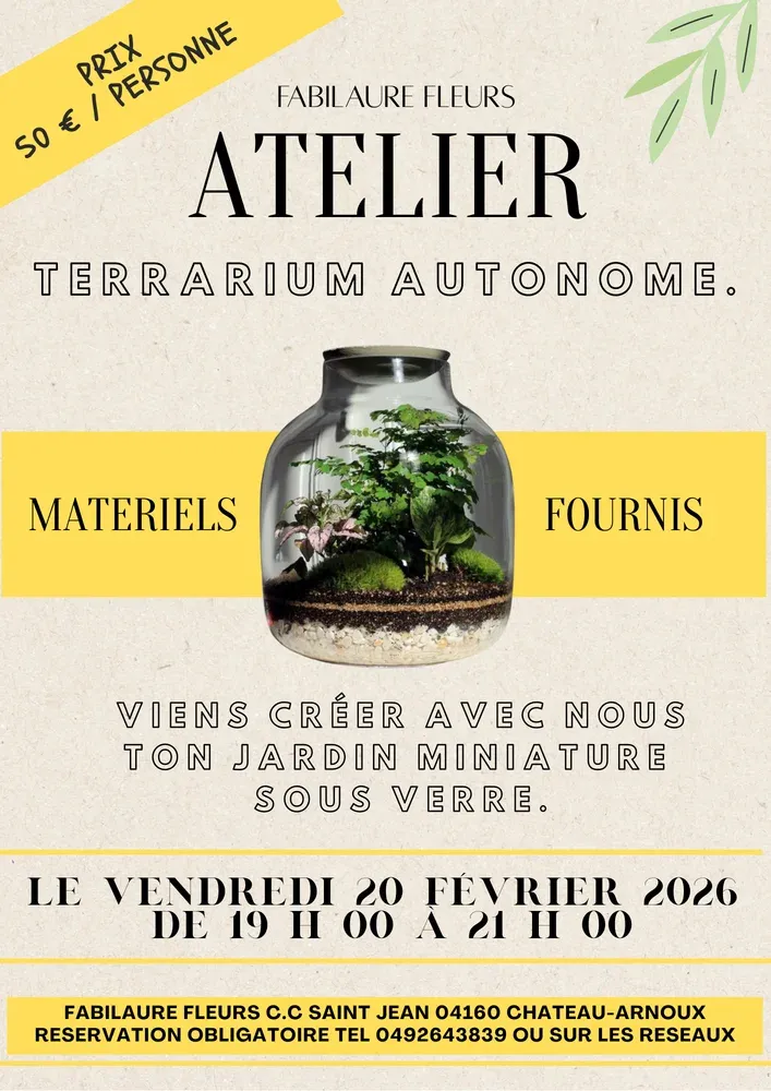 Le 20 février 2026, rejoignez-nous pour un atelier terrarium autonome. Pour 50 € par personne, tout le matériel est fourni, et vous repartez avec votre création. Cet atelier est une occasion parfaite pour laisser libre cours à votre créativité dans une ambiance conviviale. Réservation obligatoire au 0492643839 ou sur nos réseaux sociaux.
