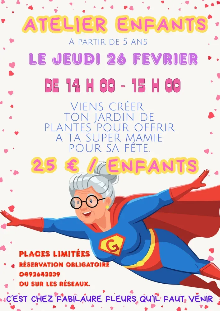 Le 26 février, atelier enfants, célébrez la fête des mamies avec un atelier jardin spécialement conçu pour l'occasion. Venez créer un cadeau floral unique et mémorable pour votre mamie.