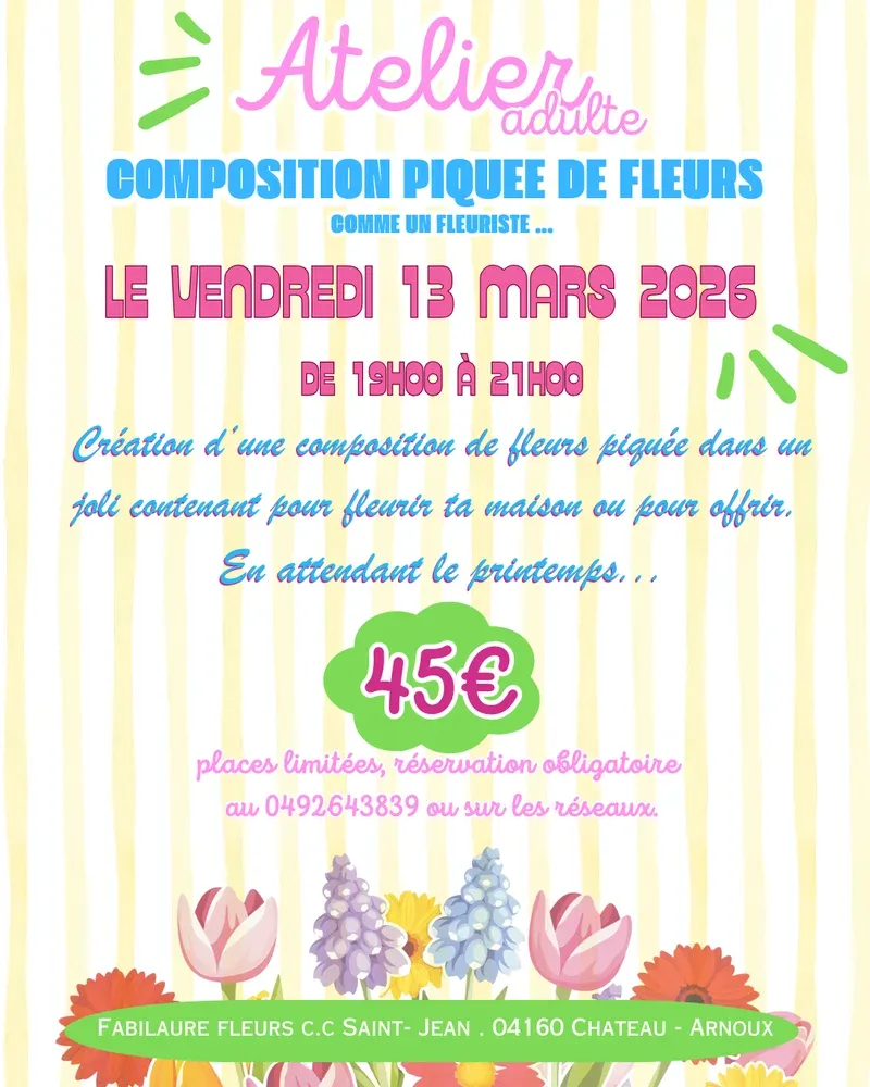 Le 13 mars, apprenez à réaliser une composition de fleurs fraîches. Cet atelier vous permettra de découvrir les techniques de base pour créer de magnifiques arrangements floraux.